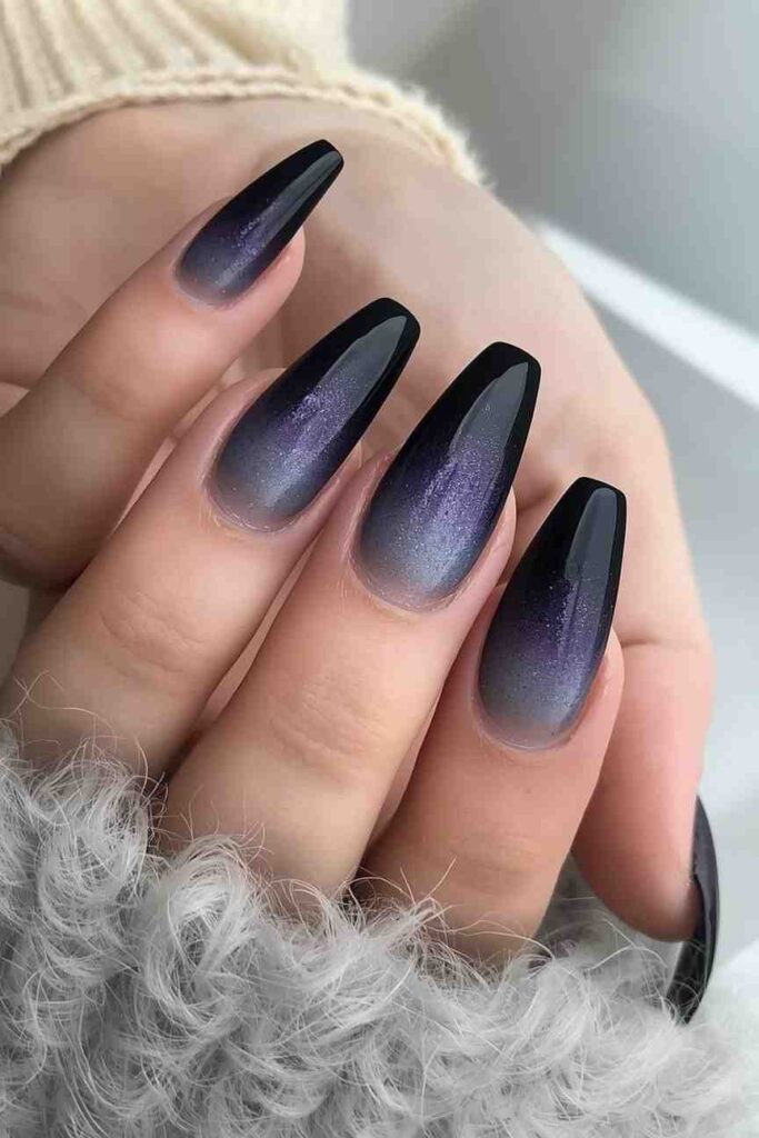 Create a magical gradient that fades from deep purple or black to smoky gray. The ombre effect feels like twilight — mysterious, enchanting, and smooth. Add a thin layer of shimmer polish for a hint of sparkle that catches the light beautifully. It’s a refined nod to witchy aesthetics without being overdone.