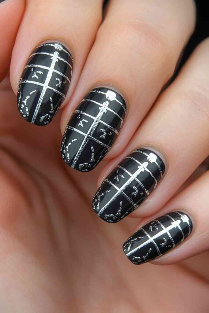 For a futuristic take, draw minimalist skeleton-inspired lines using metallic silver over black or gray nails. This sleek geometric interpretation feels edgy yet elegant. The contrast adds intrigue without the need for overly detailed artwork — perfect for a modern Halloween manicure.