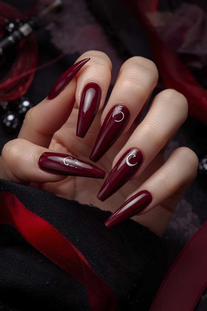Deep burgundy nails are the epitome of dark romance. Pair with a glossy topcoat for a rich, blood-like shine. Add subtle gold or black detailing near the edges for an extra luxurious feel. This timeless color exudes confidence, elegance, and a whisper of Halloween seduction.