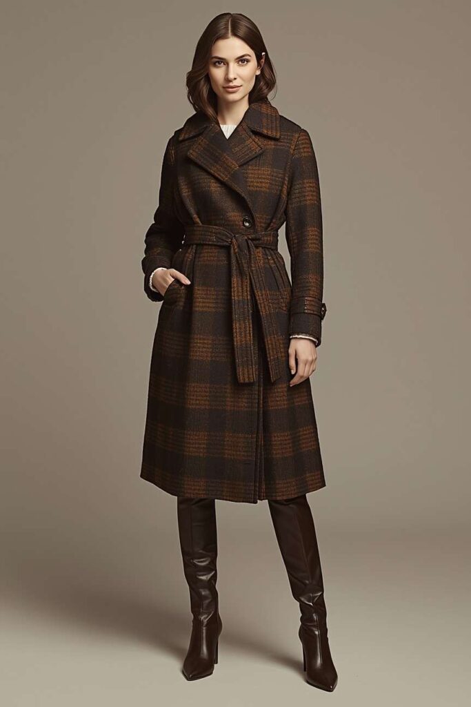 Choose a neutral-toned belted coat and pair it with fitted trousers or a knit dress. Style with knee-high or block-heeled ankle boots, a structured handbag, and delicate jewelry for a refined cold-day ensemble.