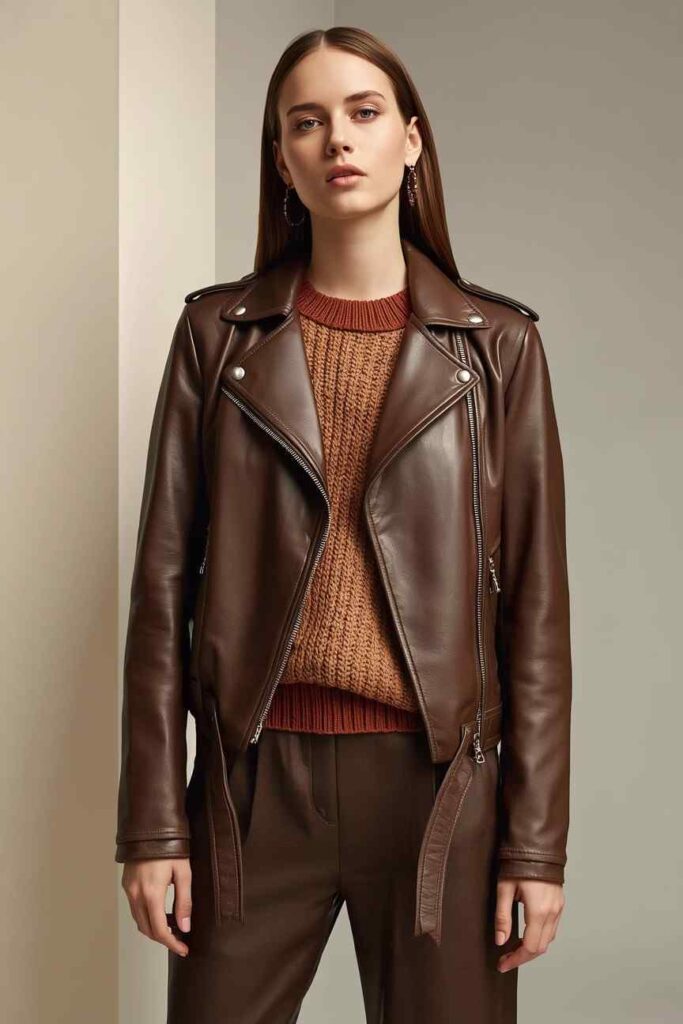 Pair your faux leather jacket with a fitted ribbed sweater, straight-leg or high-waisted jeans, and ankle boots. Add a long scarf for contrast, and choose minimalistic accessories to maintain a balanced look.