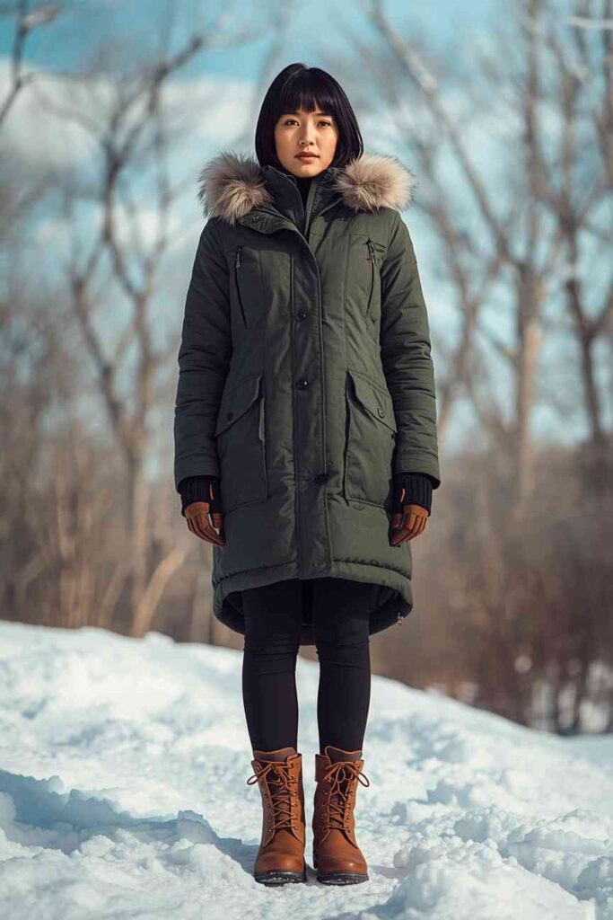 For those extra-chilly days, a hooded parka is your best companion. Paired with sturdy winter boots, this outfit ensures maximum warmth while maintaining style. It’s ideal for outdoor activities, travel, or snowy weather.