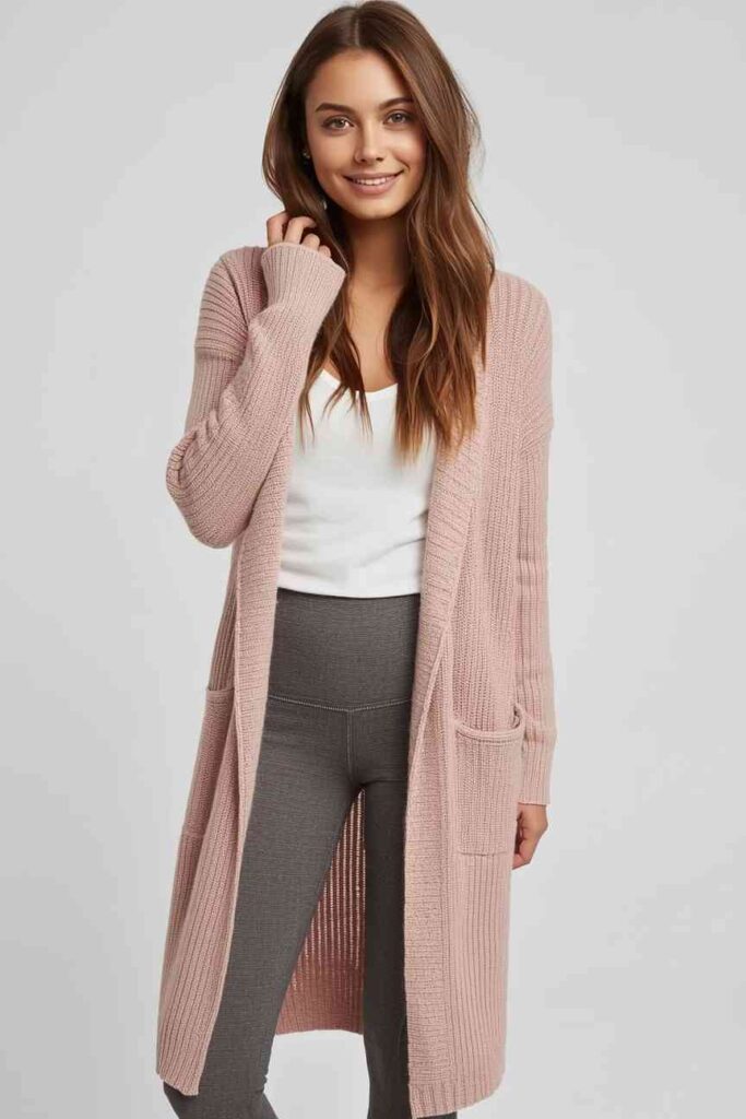 A long cardigan paired with leggings is a cozy December favorite—warm, soft, and effortlessly stylish. The cardigan provides coverage and comfort, while leggings balance the silhouette with a sleek finish.