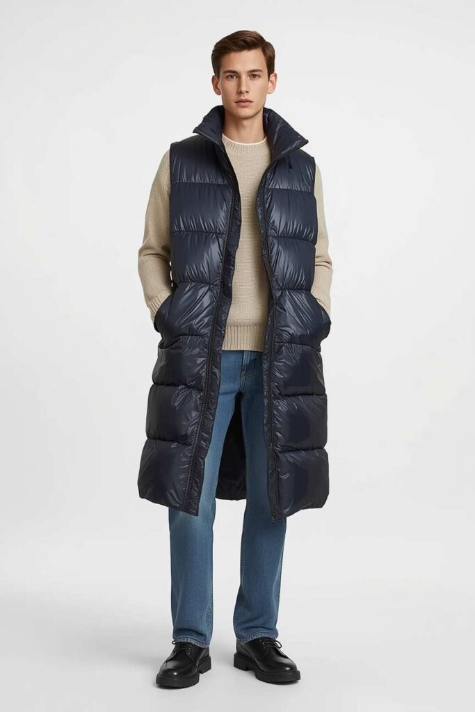 A long puffer vest layered over a sweater and jeans offers a functional yet stylish winter combination that’s perfect for December days when you need warmth without bulky restriction. The extended length of the puffer vest adds insulation and creates a flattering vertical line, while the cozy sweater underneath adds softness and texture.