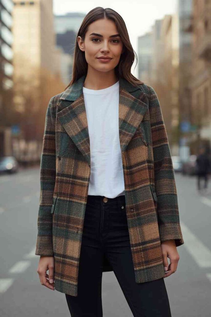 A plaid coat instantly adds visual interest and seasonal charm to any December outfit. With its patterned structure and cozy construction, it serves as a statement piece while keeping you warm. Pairing it with black skinny jeans creates a flattering silhouette and allows the coat to take center stage.