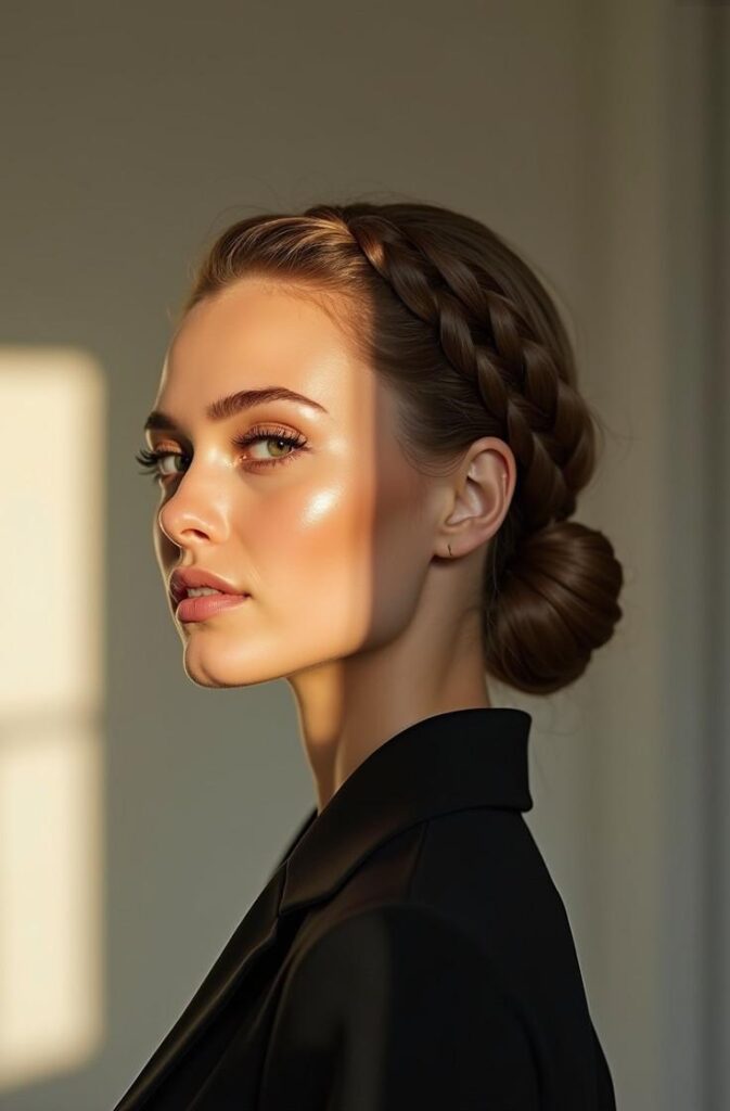 A rustic braided bun captures cabin-in-the-snow charm. The braid adds texture and warmth, while the bun keeps everything secure and stylish. This style is especially nice for winter adventures—from ice skating to tree-lighting events. It leans toward a cozy aesthetic, making it great with plaid coats, chunky knitwear, or fur-lined jackets.