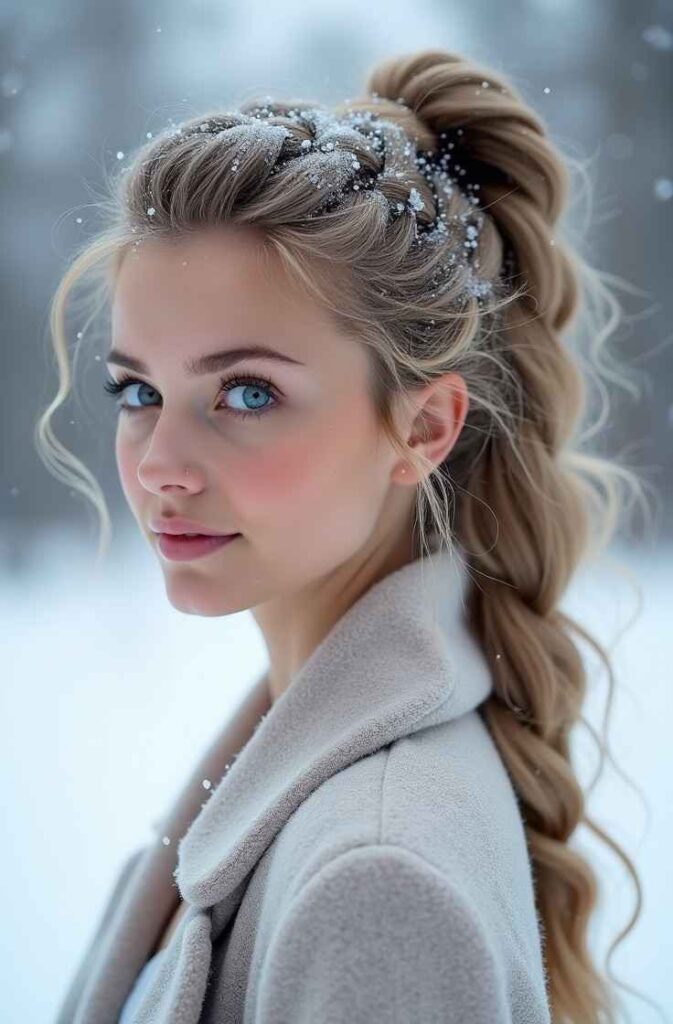 The braid adds dimension and a frosty, textured appearance, while the pony element keeps the look light and energetic. Add shimmering clips or silver ties for an instant winter-wonderland effect that enhances your seasonal outfit effortlessly.