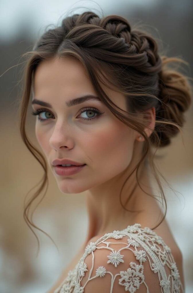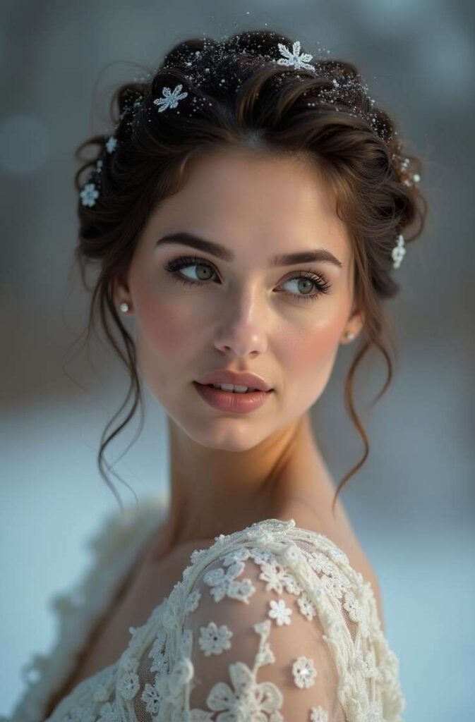 Soft pieces frame the face, adding warmth and glow against winter’s crisp backdrop. This updo pairs beautifully with lace, satin, and velvet—making it a stunning choice for anyone wanting a sophisticated yet natural winter hairstyle that captures the season’s delicate charm.