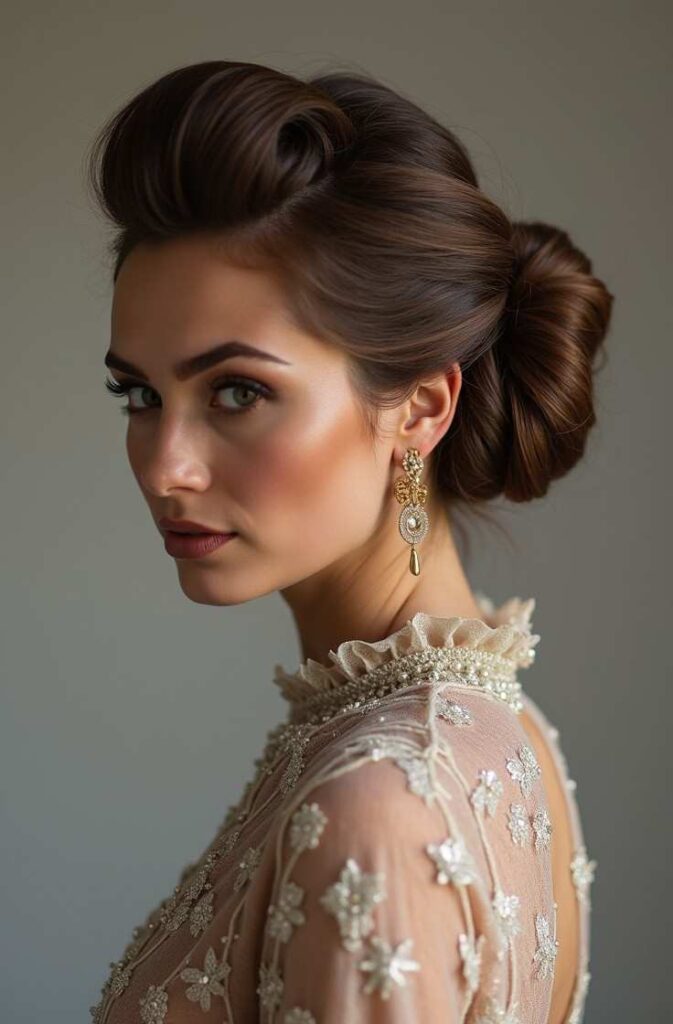 The Sleek Winter Roll channels vintage glamour with a modern seasonal twist. Inspired by old-Hollywood elegance, this polished rolled updo gives a structured yet smooth finish that looks immaculate under winter lighting. It’s a timeless choice for formal events, evening parties, and holiday galas, offering sophistication that never goes out of style.