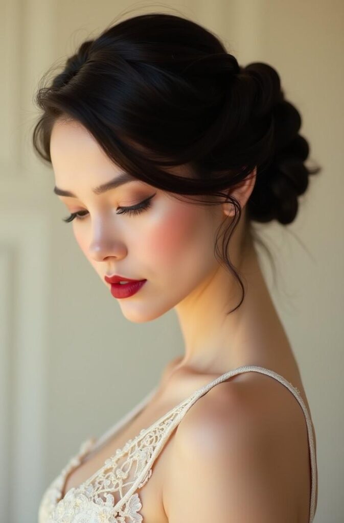 What sets this style apart is its timeless feel and versatility. Whether for a winter gala, Christmas celebration, or romantic date night, this chignon offers a touch of polished glamour without overwhelming your look. It’s perfect for anyone wanting a minimal yet sophisticated updo that captures the serene beauty of winter.