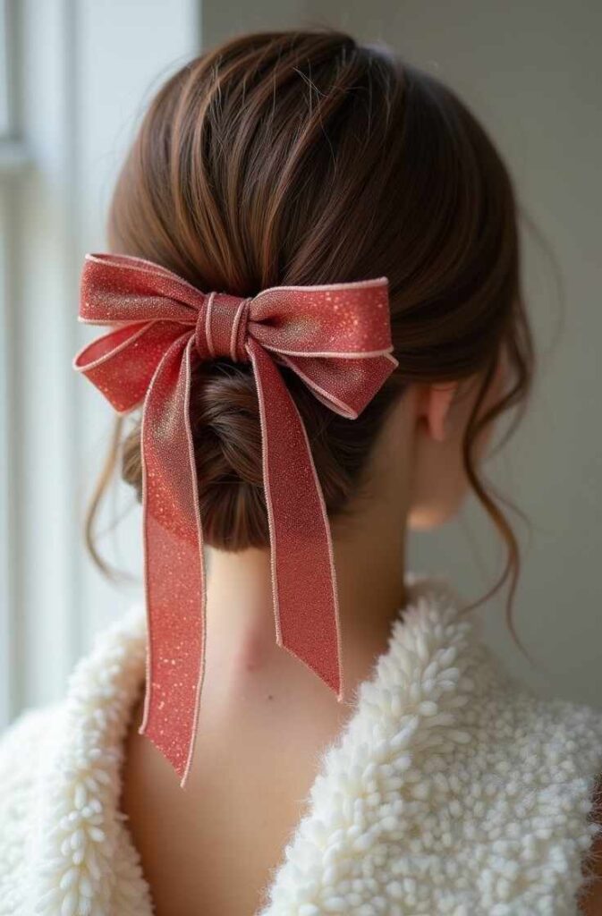 The ribbon adds softness and warmth, giving your hairstyle a seasonal, storybook feel reminiscent of holiday classics. Whether paired with knitwear, winter dresses, or playful accessories, the ribbon bun creates a polished, sweet, and beautifully coordinated winter aesthetic that enhances every outfit.