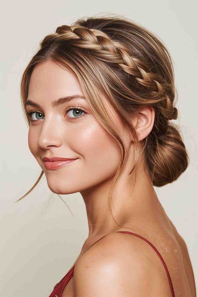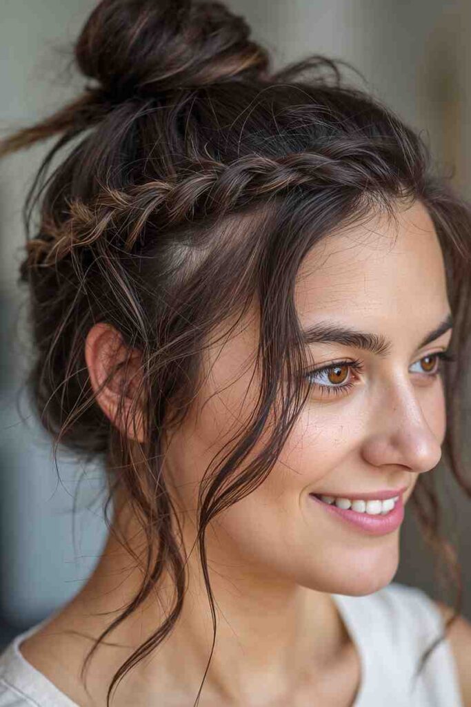 This hairstyle combines a braid and a bun for a balanced, casual-chic look.