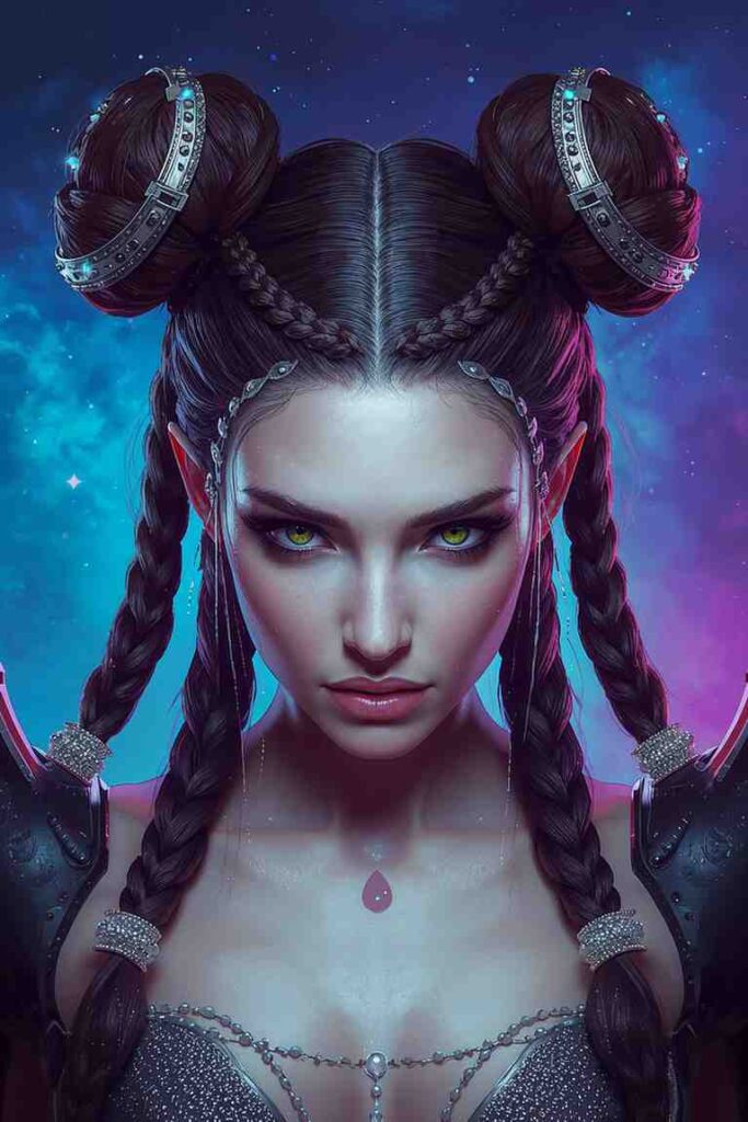 Combine braids with double buns for a structured but playful look—ideal for witches, aliens, or villains.