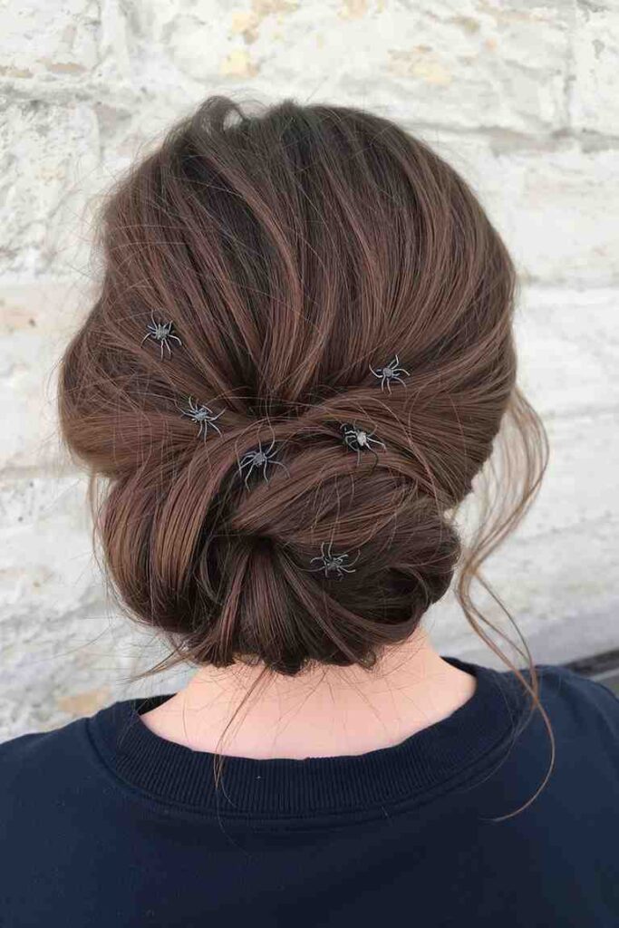 The classic messy bun gets a Halloween twist with tiny spider or bat clips tucked into the hair. It’s quick, playful, and perfect for last-minute styling.