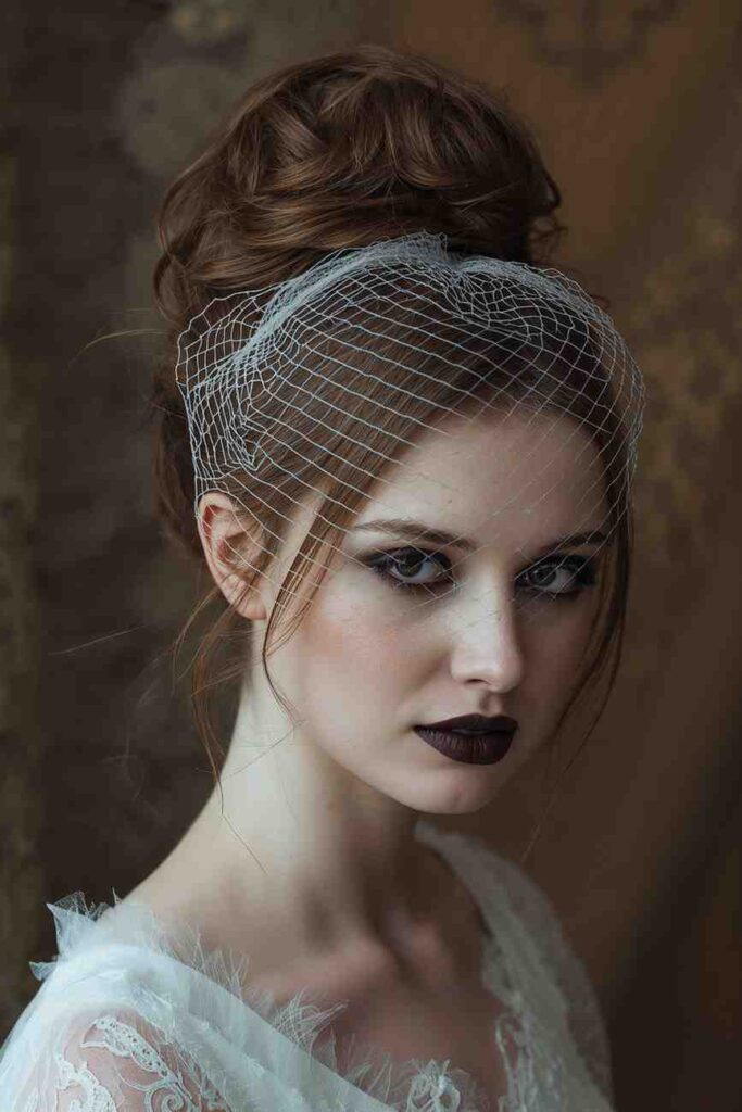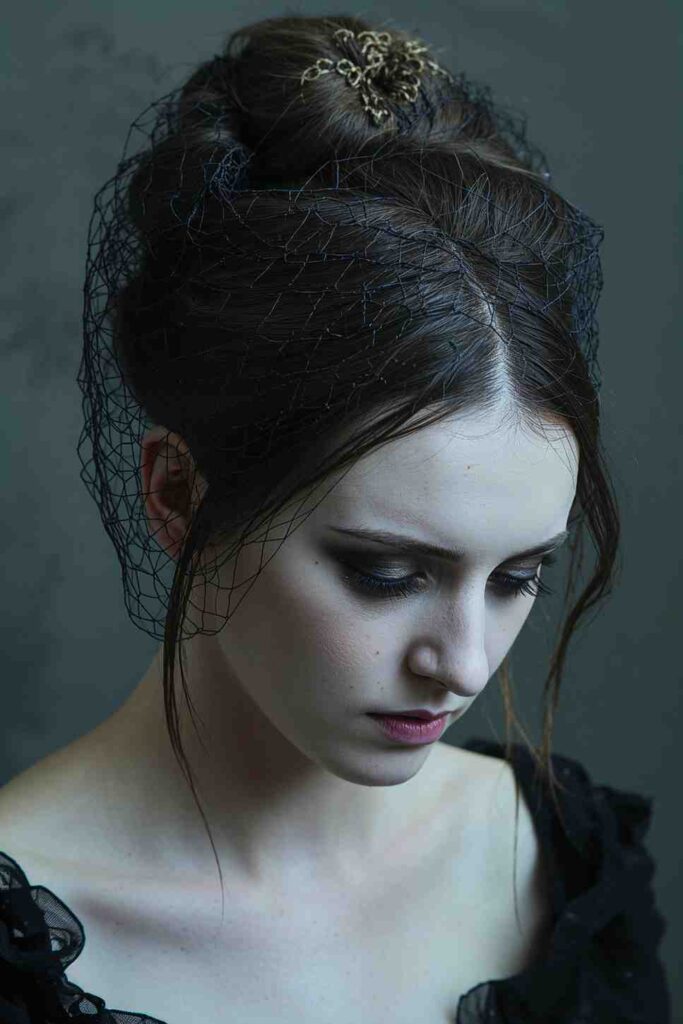 Perfect for ghostly brides or witches, a high messy bun topped with a mini veil or net creates a dramatic effect.