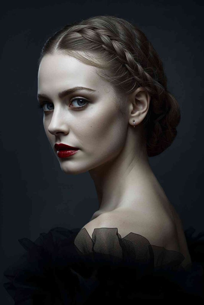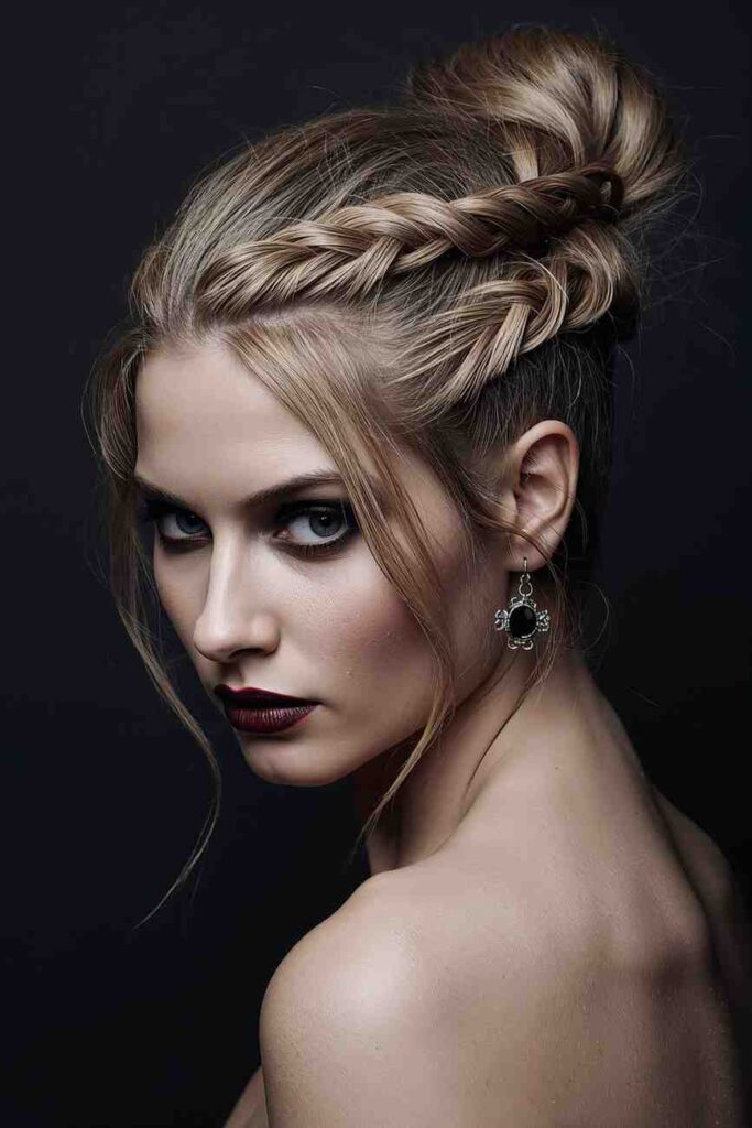 A low braided bun combines elegance with a touch of mystery. It’s great for witches, vampires, or gothic looks.