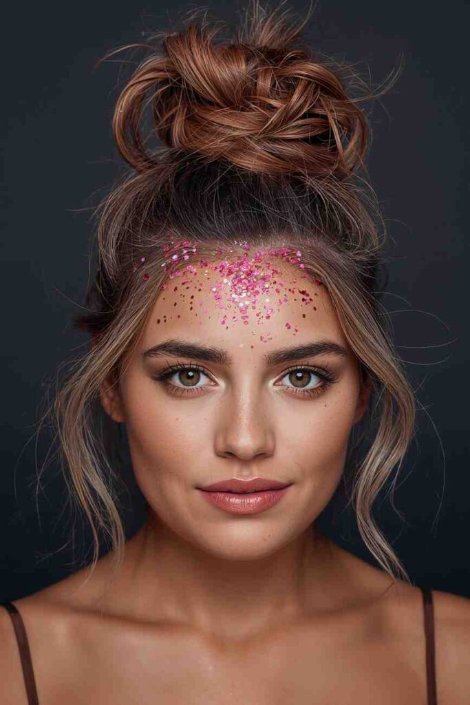 Style suggestions: Apply hair gel along the part, sprinkle glitter, and secure your top knot loosely. Pair with bold eye makeup for balance.