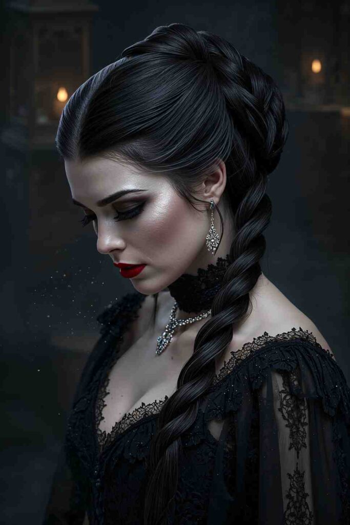 Style suggestions: Braid your hair into a low ponytail, twist it into a bun, and secure. Add lace or dark ribbon for a dramatic touch.