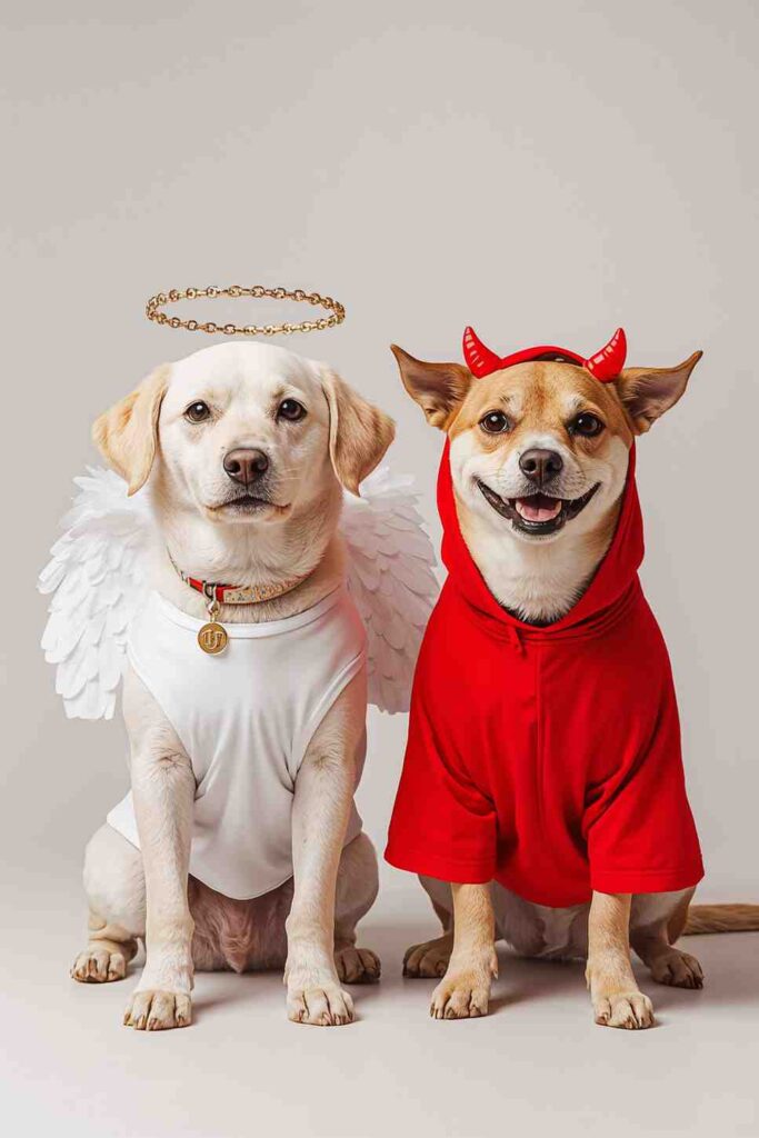 One of you can dress as a sweet angel while the other embraces a devilish vibe—whichever suits your pet’s personality best!
