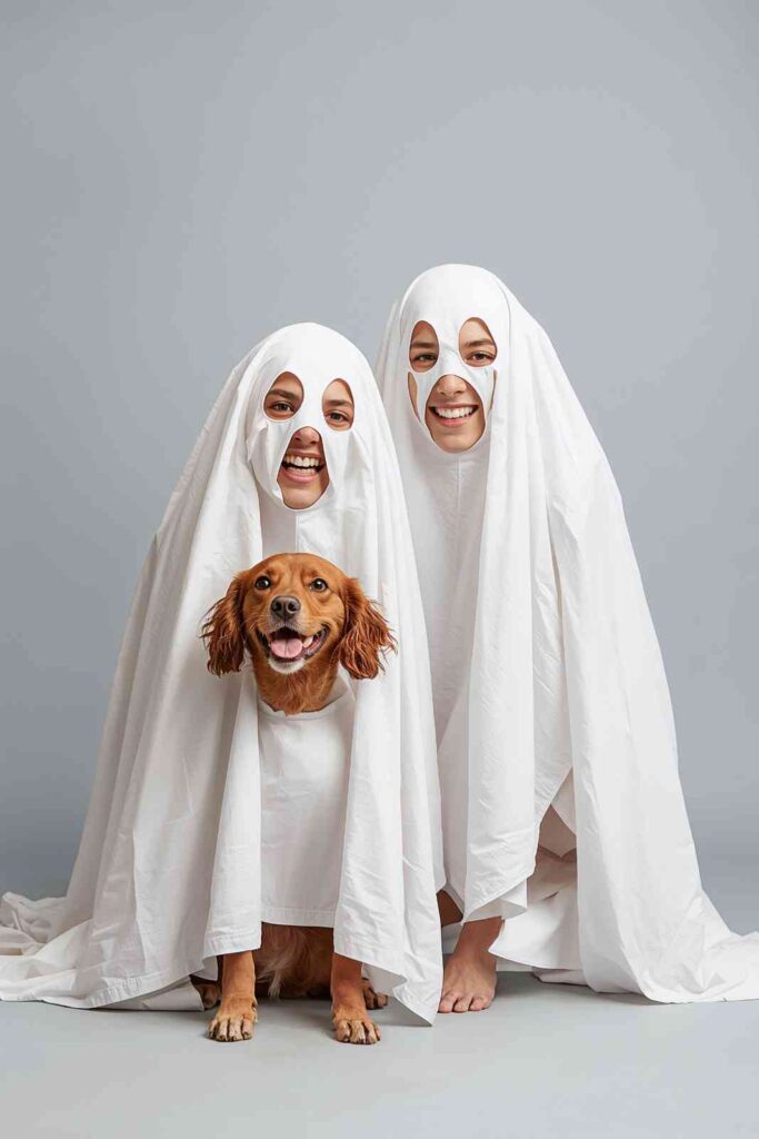 White sheets with eye cutouts make this a simple, budget-friendly look for both you and your pet.