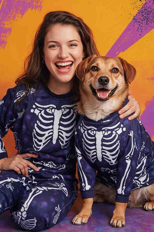 Skeleton print outfits are easy to find and perfect for both you and your pet.