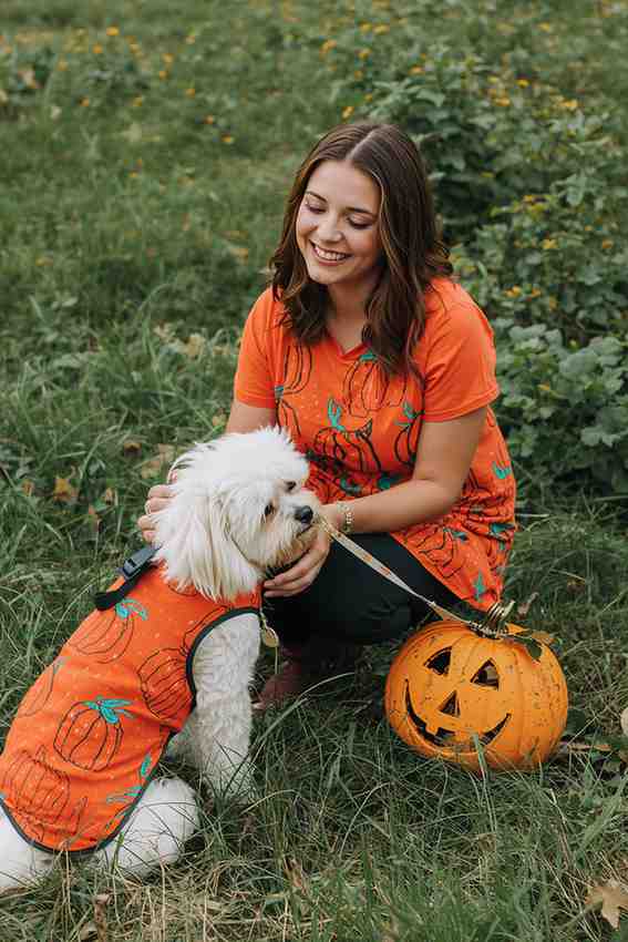Go as a pumpkin patch duo with matching orange outfits. You can wear a pumpkin-printed dress or tee while your pet wears a pumpkin onesie or harness.