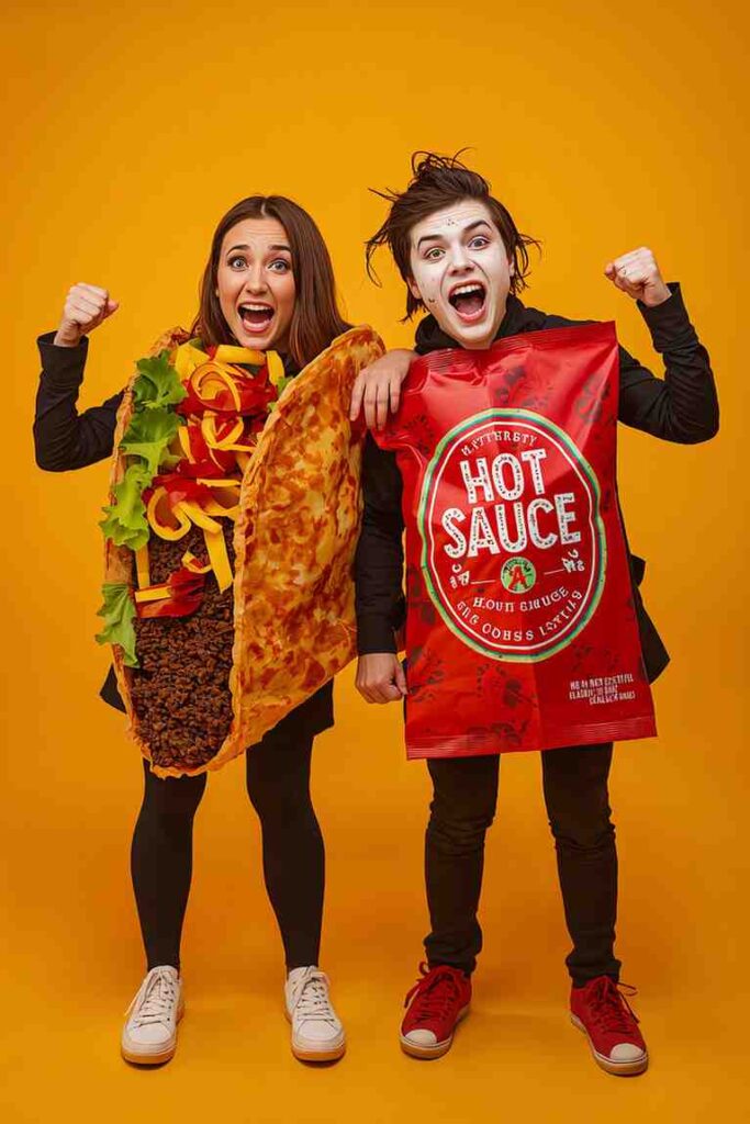 Food lovers will adore this combo! One of you dresses as a taco, the other as a hot sauce packet.