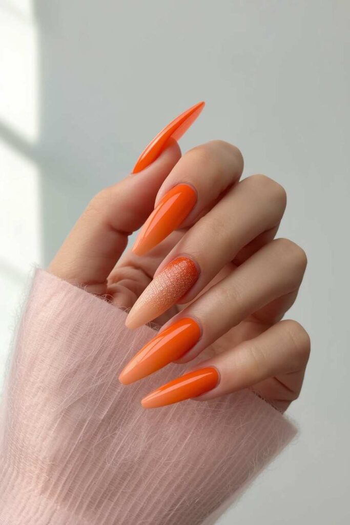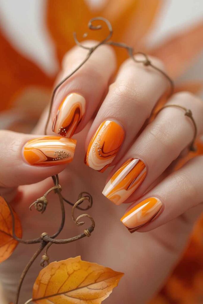 An ombre effect using burnt orange creates depth and visual appeal. Blending with nude or brown tones adds dimension, making it a standout seasonal design.