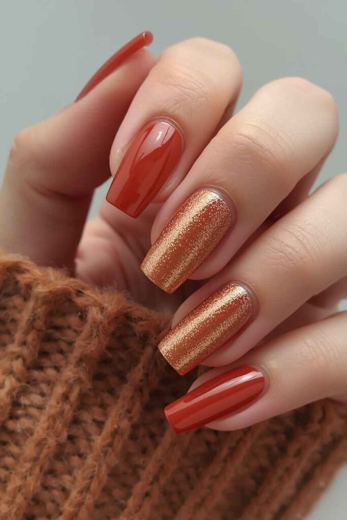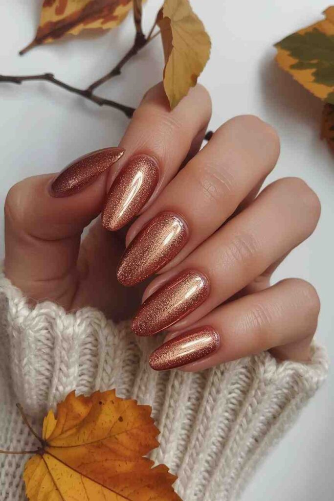 Copper nails bring metallic warmth to autumn manicures. Their reflective finish makes them stand out, especially when paired with darker autumn tones.