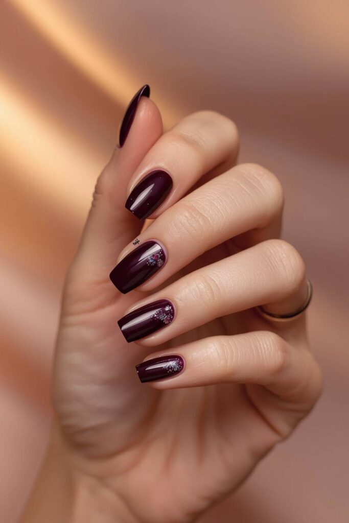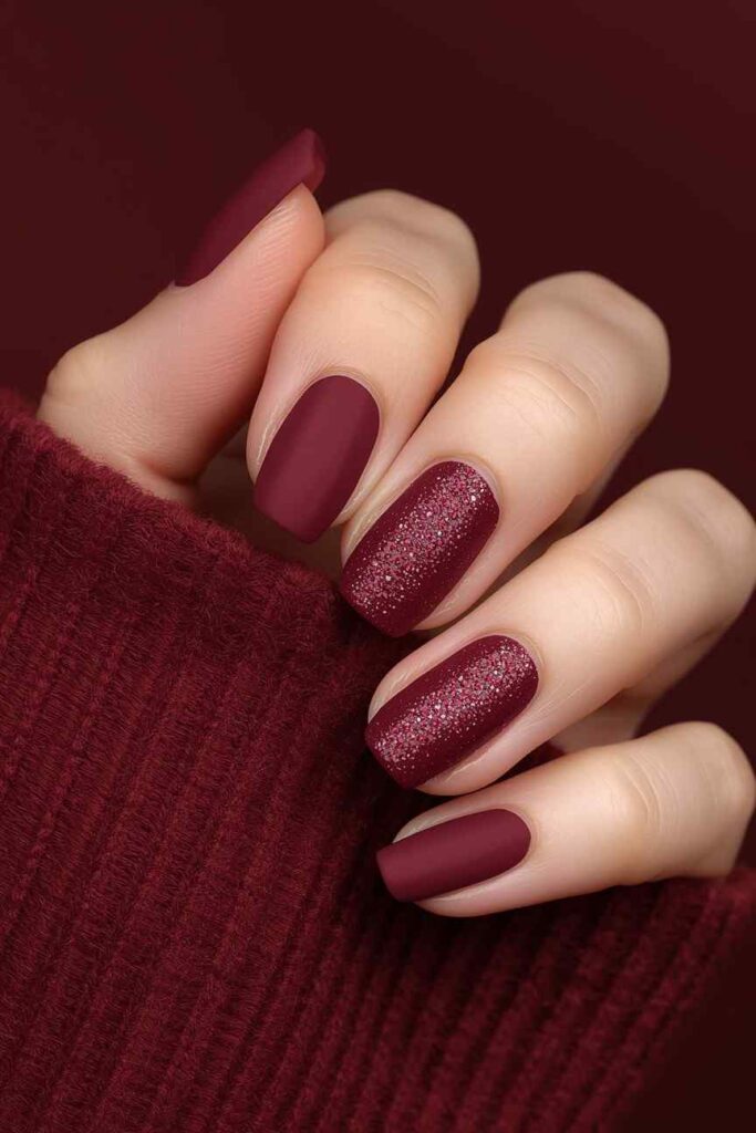 Burgundy is timeless for fall, offering richness and depth. Its bold yet elegant nature makes it perfect for weddings, parties, or everyday wear. Accents like glitter tips enhance the look beautifully.