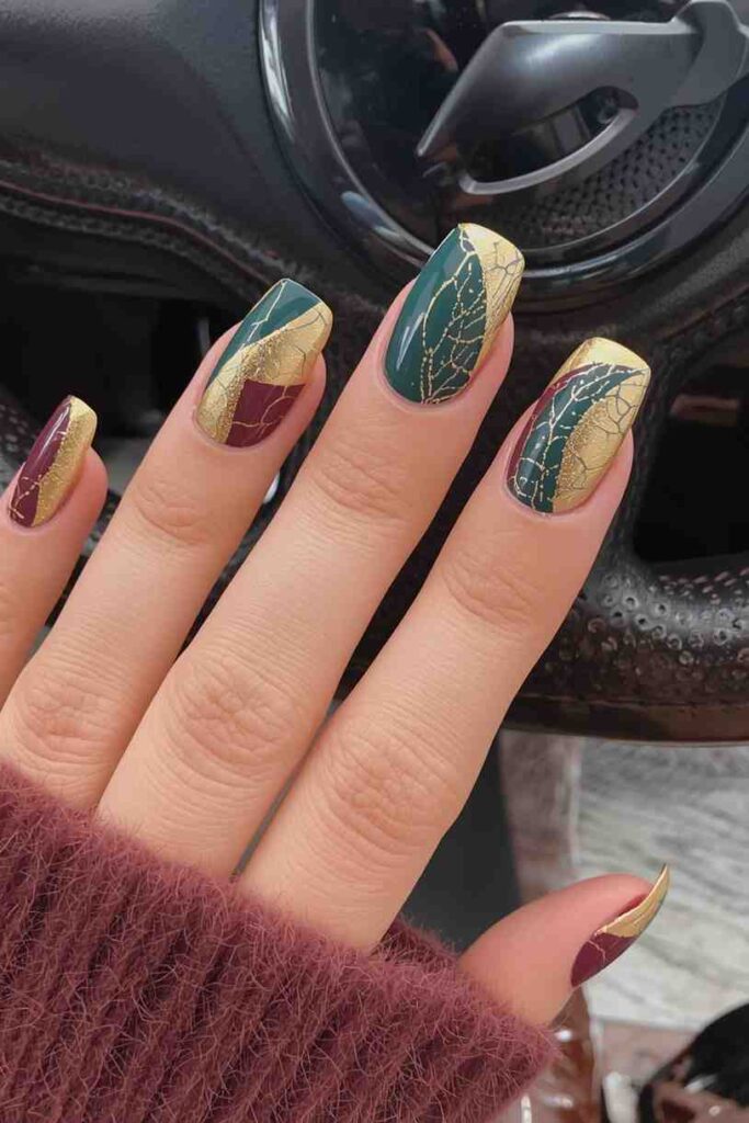 Gold foil brings luxury to autumn nails. Paired with deep shades like burgundy, green, or plum, foil accents create a glamorous, high-fashion effect for special occasions.