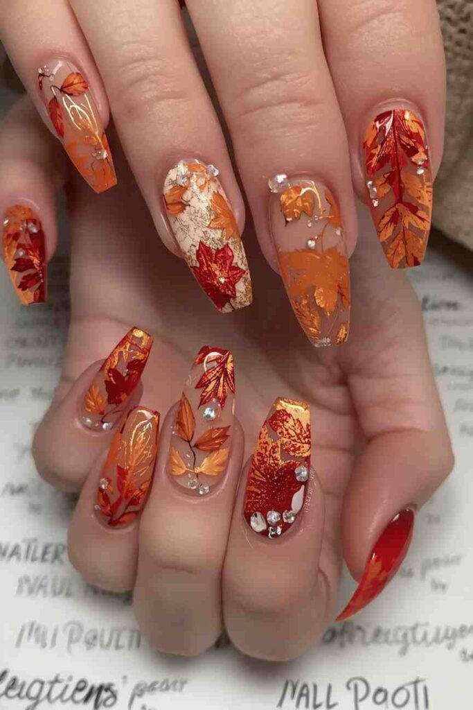 Leaf motifs bring autumn to life on nails. Using warm tones like orange, red, and gold, leaf nail art captures the beauty of fall foliage.
