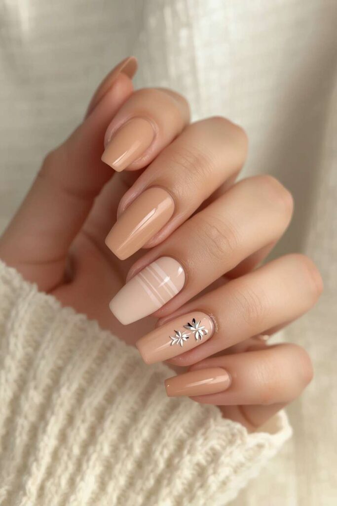 Beige nails offer understated elegance for fall. They serve as a versatile base for minimalist art or subtle glitter accents, making them ideal for everyday sophistication.