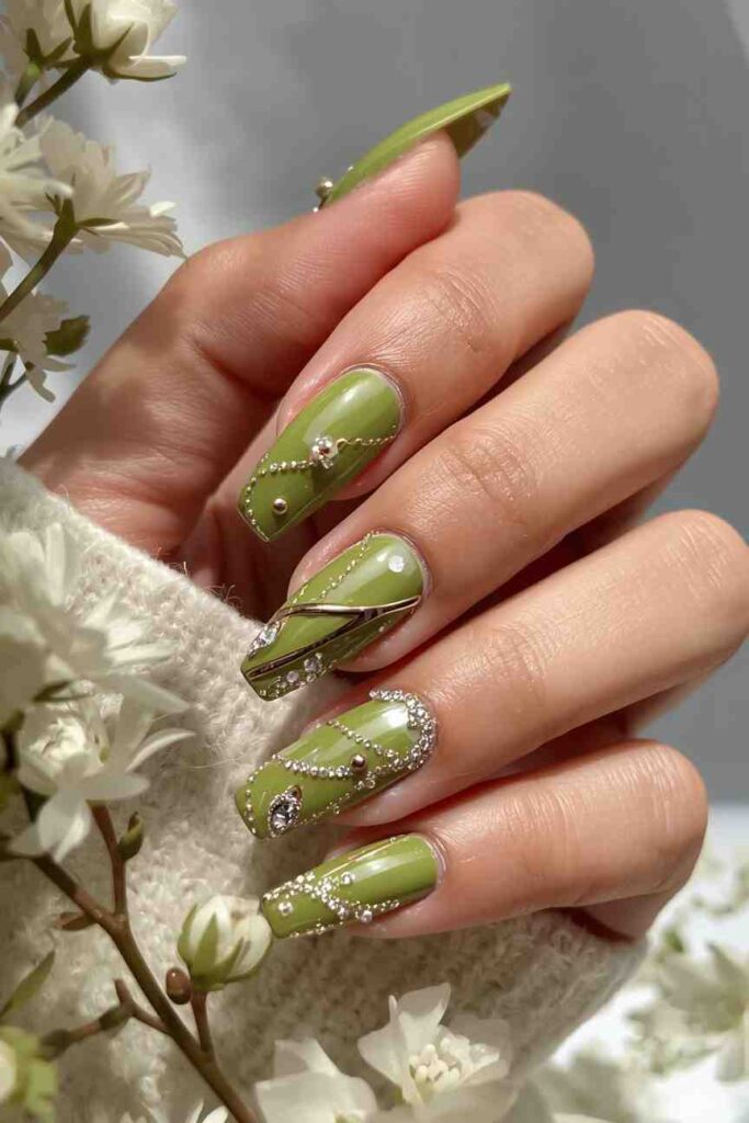 Olive green nails bring an earthy, nature-inspired vibe. This muted shade works well with gold detailing or plaid nail art, offering a stylish and trendy seasonal manicure.