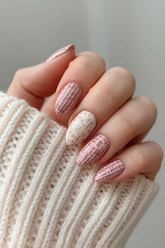 Sweater nails mimic knitwear patterns, creating a cozy, seasonal effect. Neutral or pastel bases with textured details give your manicure playful autumn charm.