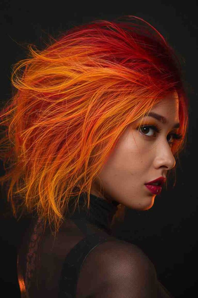 Style suggestions: Use sprays to layer the colors, then style in loose curls to mimic flickering flames.