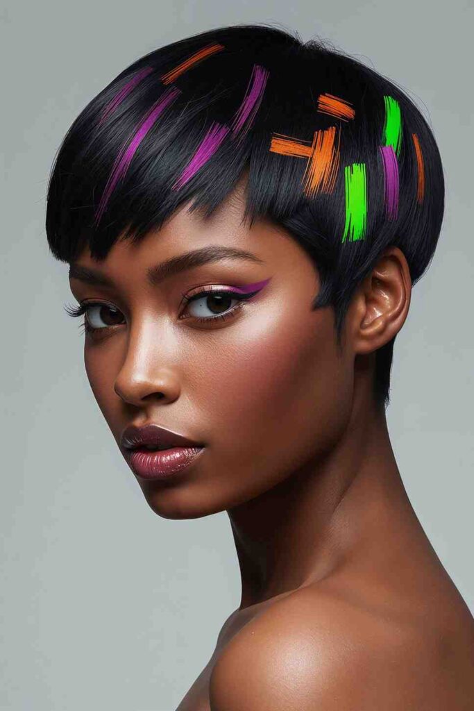 Keep it edgy by adding streaks of bright colors like orange, green, or purple to jet-black hair.
