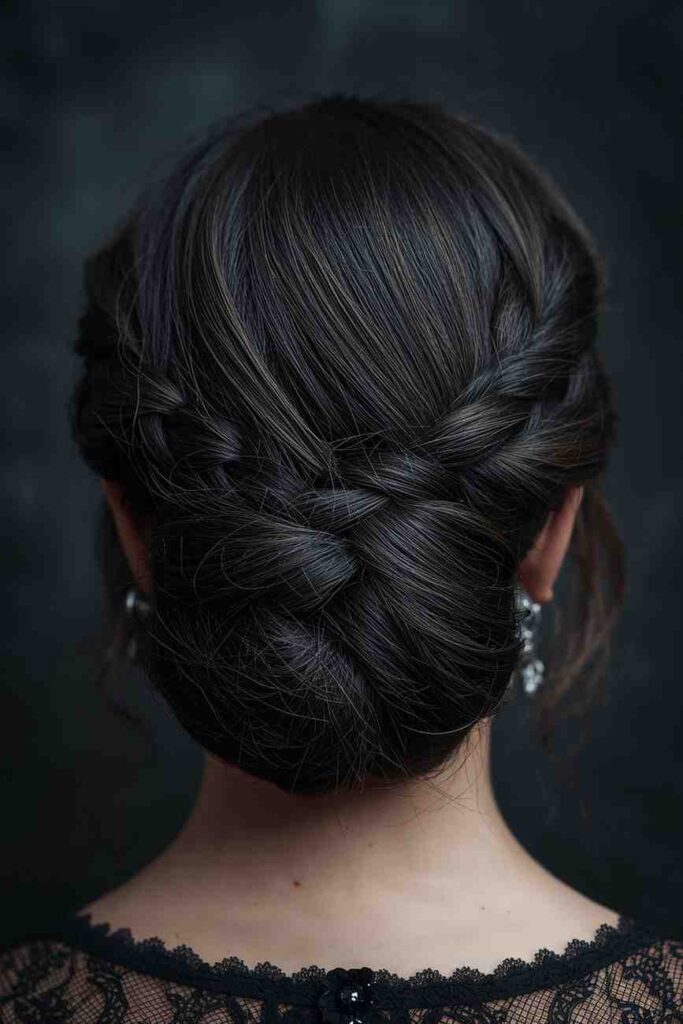 A braided bun combines elegance with structure, perfect for vampires, Victorian ghosts, or masquerade themes.