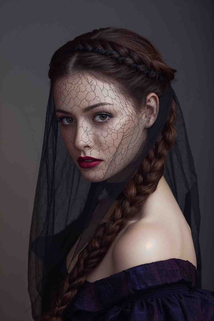 A braided halo topped with a lace or mesh veil gives a gothic, angelic, or mysterious finish.