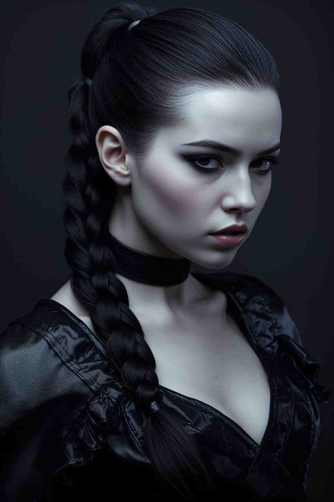 A simple ponytail braided down gives a structured, sleek finish that works with gothic queens, vampires, or futuristic costumes.