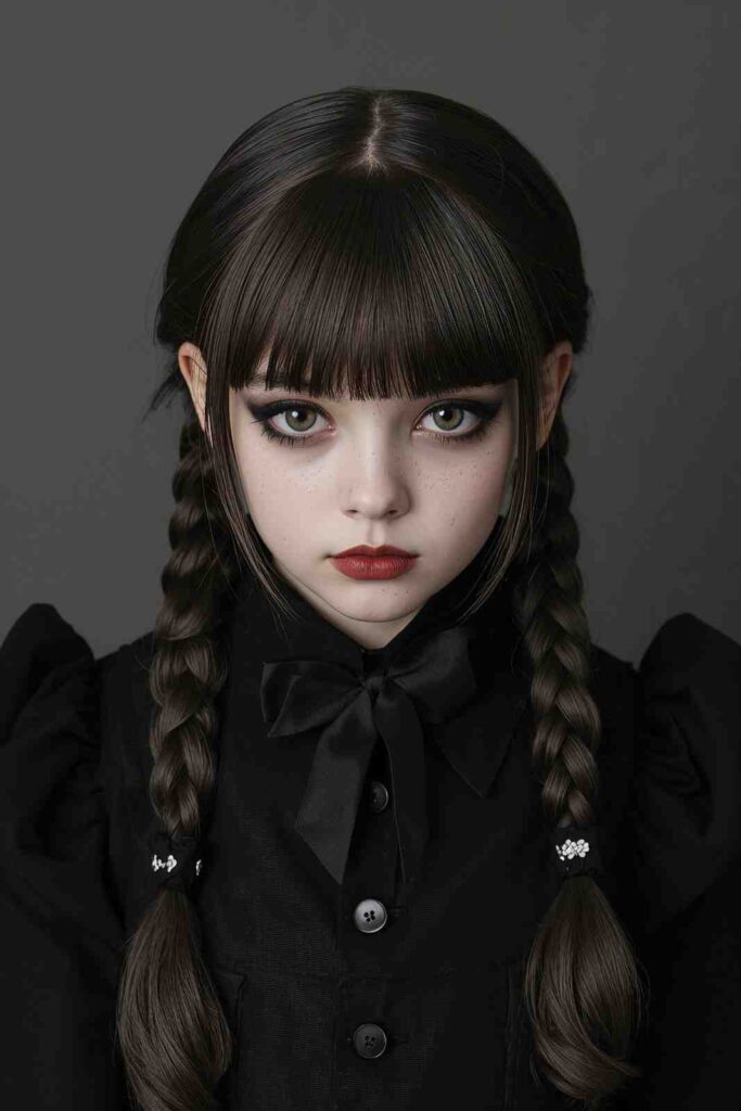 Cute but with a spooky edge, double braids work for doll costumes, gothic schoolgirl looks, or playful Halloween characters.