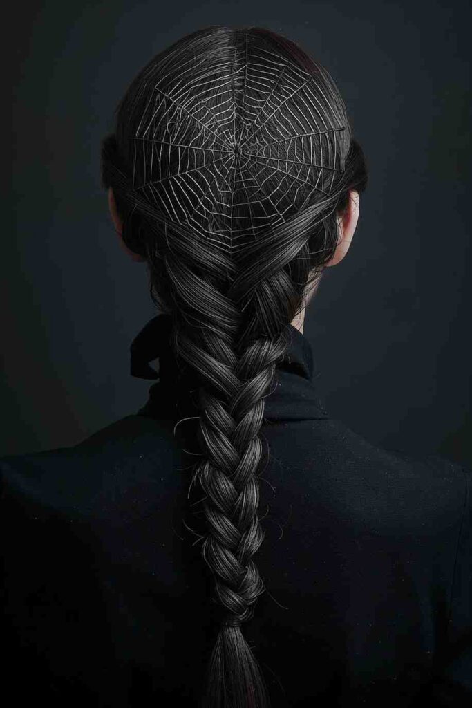 Create a central braid and section out hair into circular patterns that resemble a spider web—ideal for spooky witches or spider queens.
