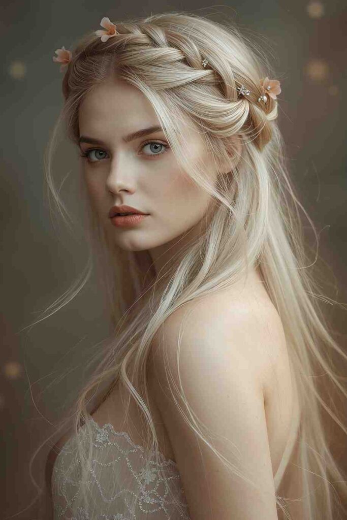 Combine a half-up style with braided sections forming a crown. This is perfect for romantic yet spooky looks, like haunted brides or woodland spirits.