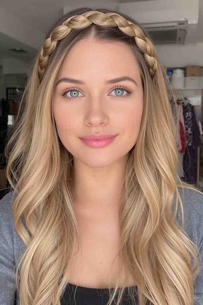 The braided headband hairstyle frames your face beautifully while keeping hair away from your eyes. It’s a chic choice for picnics, casual outings, or any day you want to look neat and stylish. The braid gives your look texture without losing the preppy elegance.