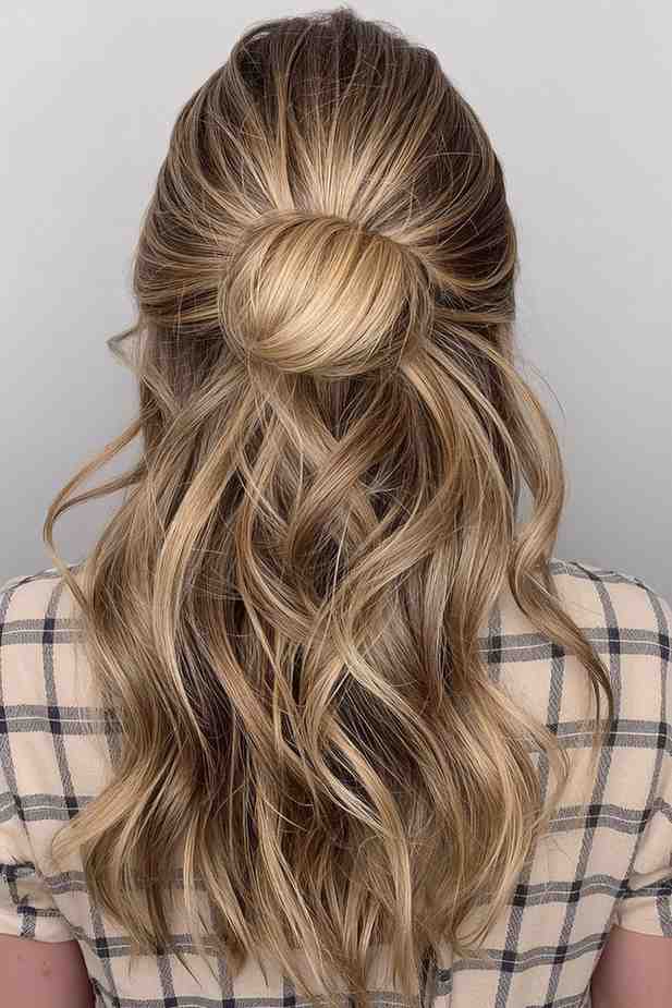The half-up bun is playful yet polished, giving off a preppy-casual charm. It works for both daytime outings and weekend brunches. This style balances laid-back curls with neat structure.