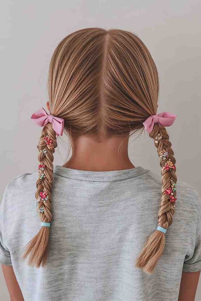 Braided pigtails combine cuteness with neatness, making them a go-to preppy look. This style works for casual outings, school, or sporting events. The braids keep hair secure while maintaining a fun, youthful vibe.