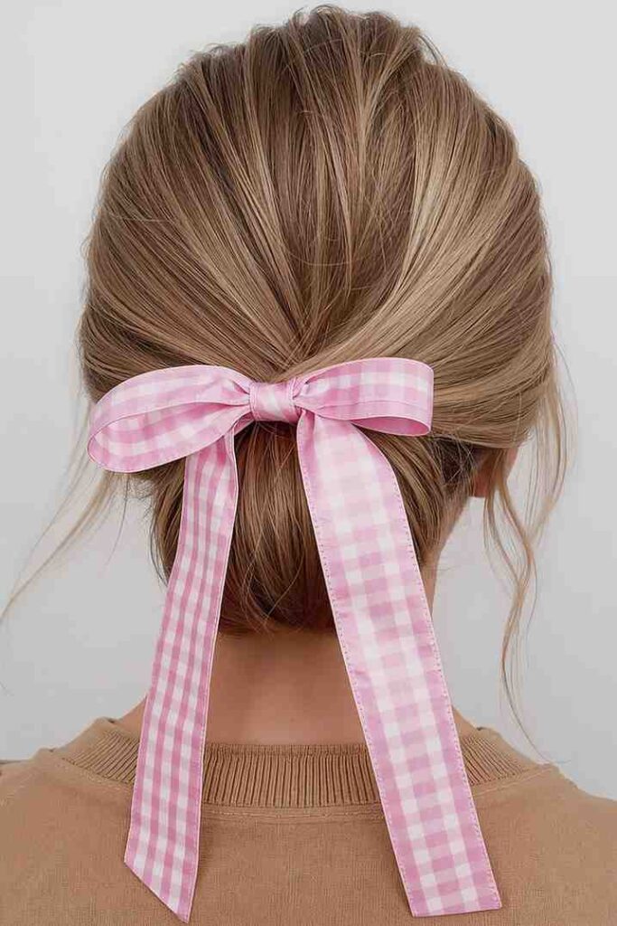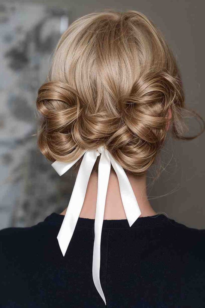 This hairstyle combines a neat bun with a ribbon, offering sophistication with a playful touch. It’s ideal for office wear, formal occasions, or stylish everyday looks. The ribbon keeps the hairstyle soft and feminine while maintaining structure.