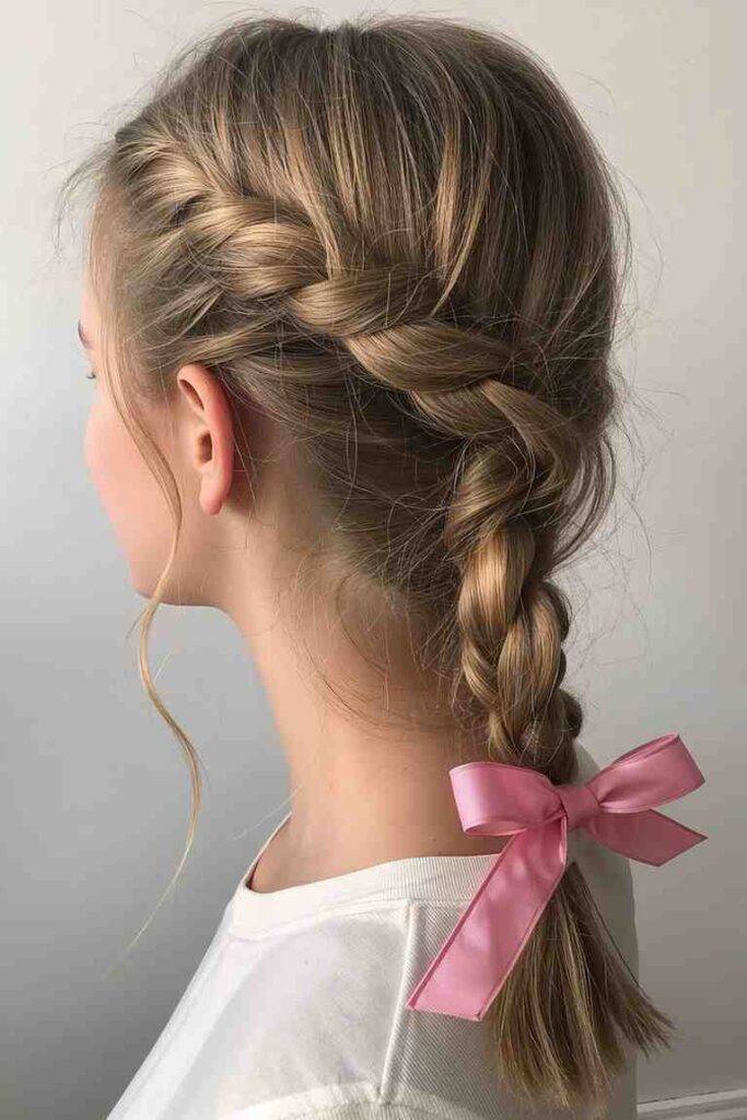 A simple side braid tied with a ribbon is one of the most classic preppy hairstyles. It’s youthful, feminine, and easy to wear for school, casual days, or outings.