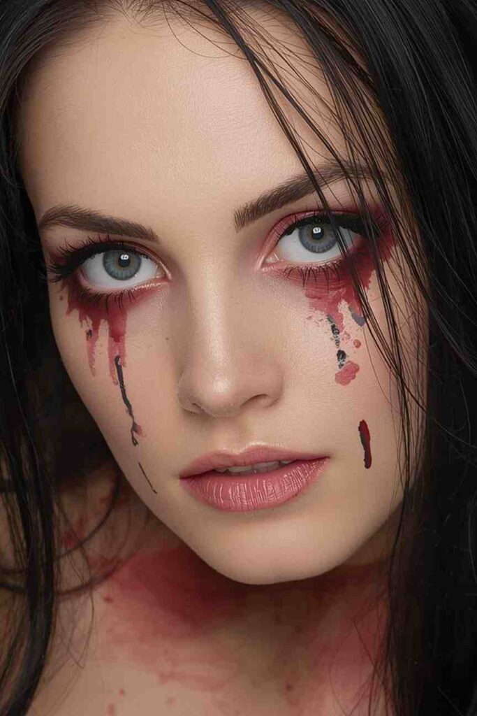 Create a “bleeding” eye effect by blending red eyeshadow from the lash line down toward the cheeks. Add thin eyeliner streaks for fake blood drips. It’s eerie, easy, and dramatic — ideal for vampire or zombie-inspired costumes.