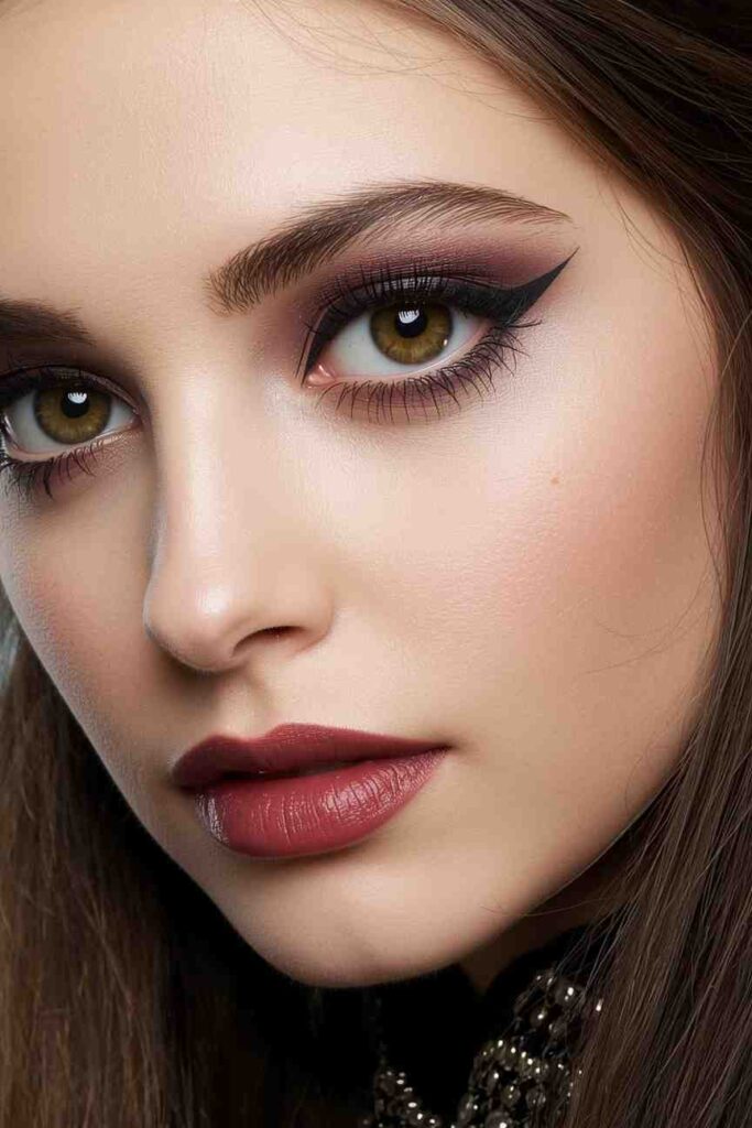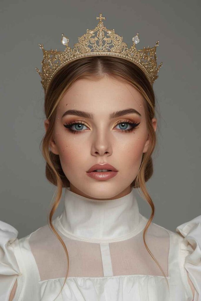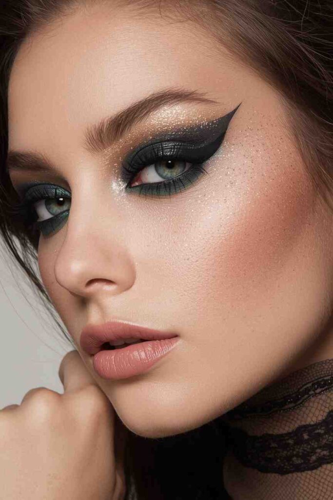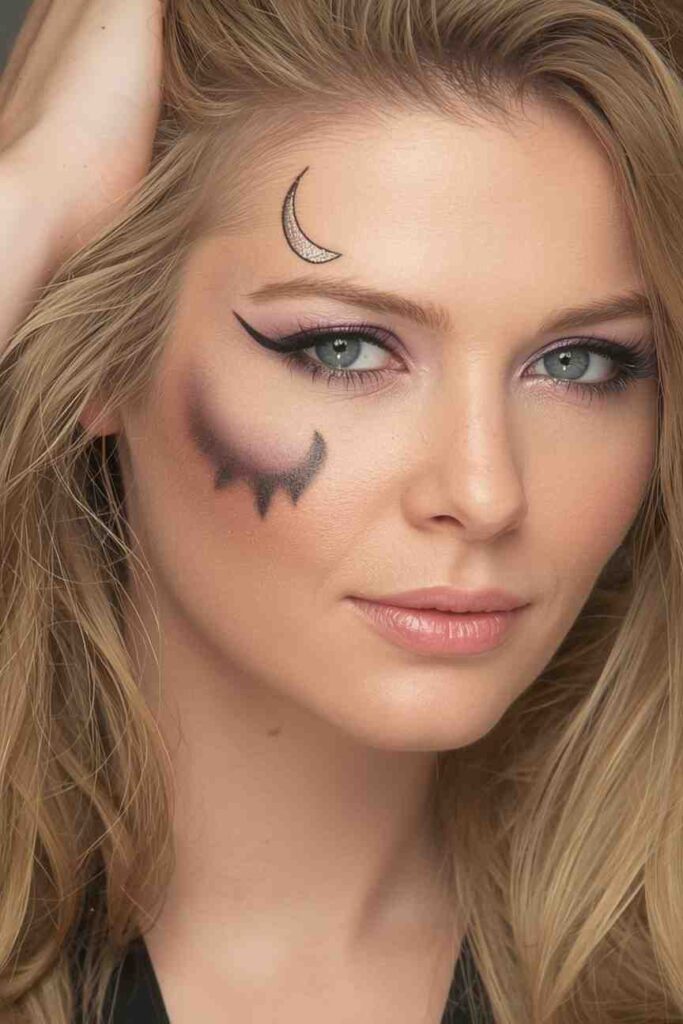 Apply gold or silver eyeshadow to your lids and draw tiny stars and moons with eyeliner. Add subtle winged liner for drama. This look is both regal and ethereal, perfect for those who prefer magical elegance over horror.